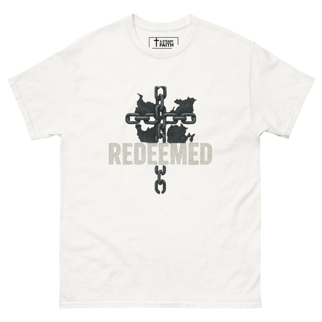 Walk boldly in your freedom with the Redeemed tee — a powerful symbol of salvation and deliverance through Christ. Featuring a rugged cross made of chains breaking apart, this design represents victory over sin and the strength that comes from being set free by grace.